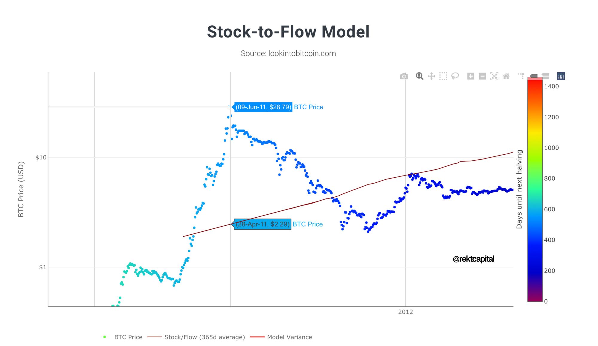 - The potential Bitcoin price point at which the Stock To Flow line was when Bitcoin’s price peaked in June 2011.