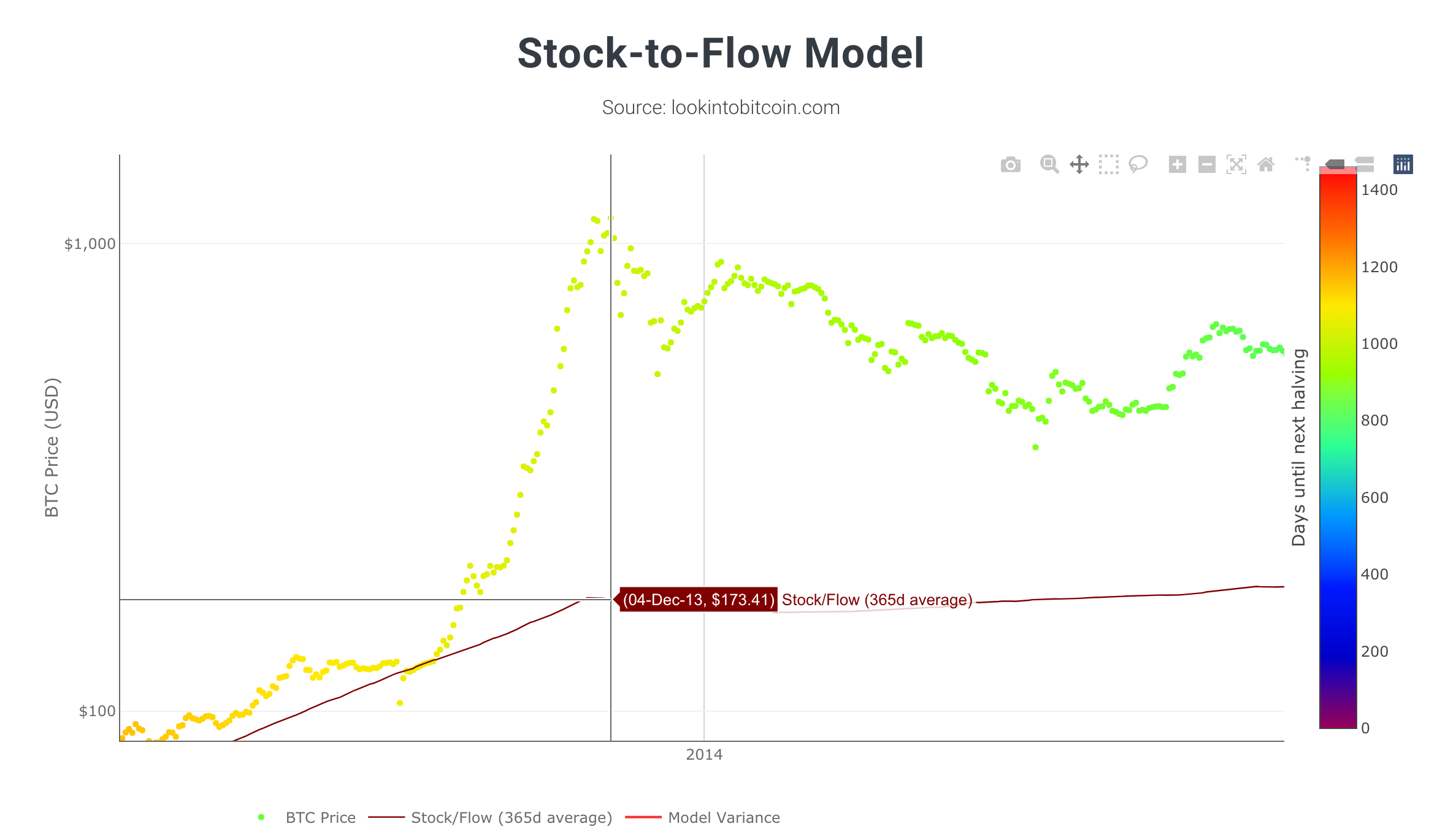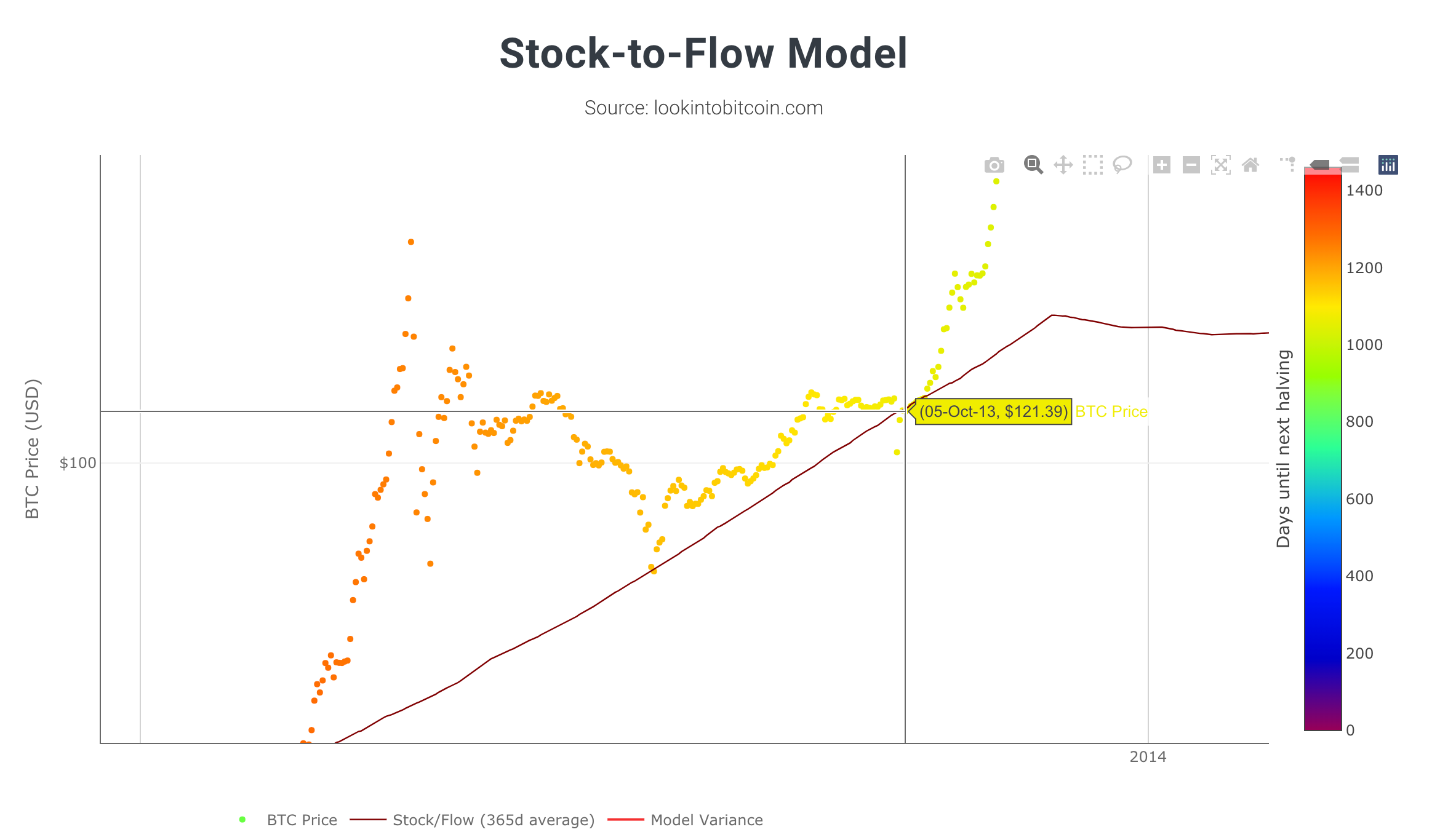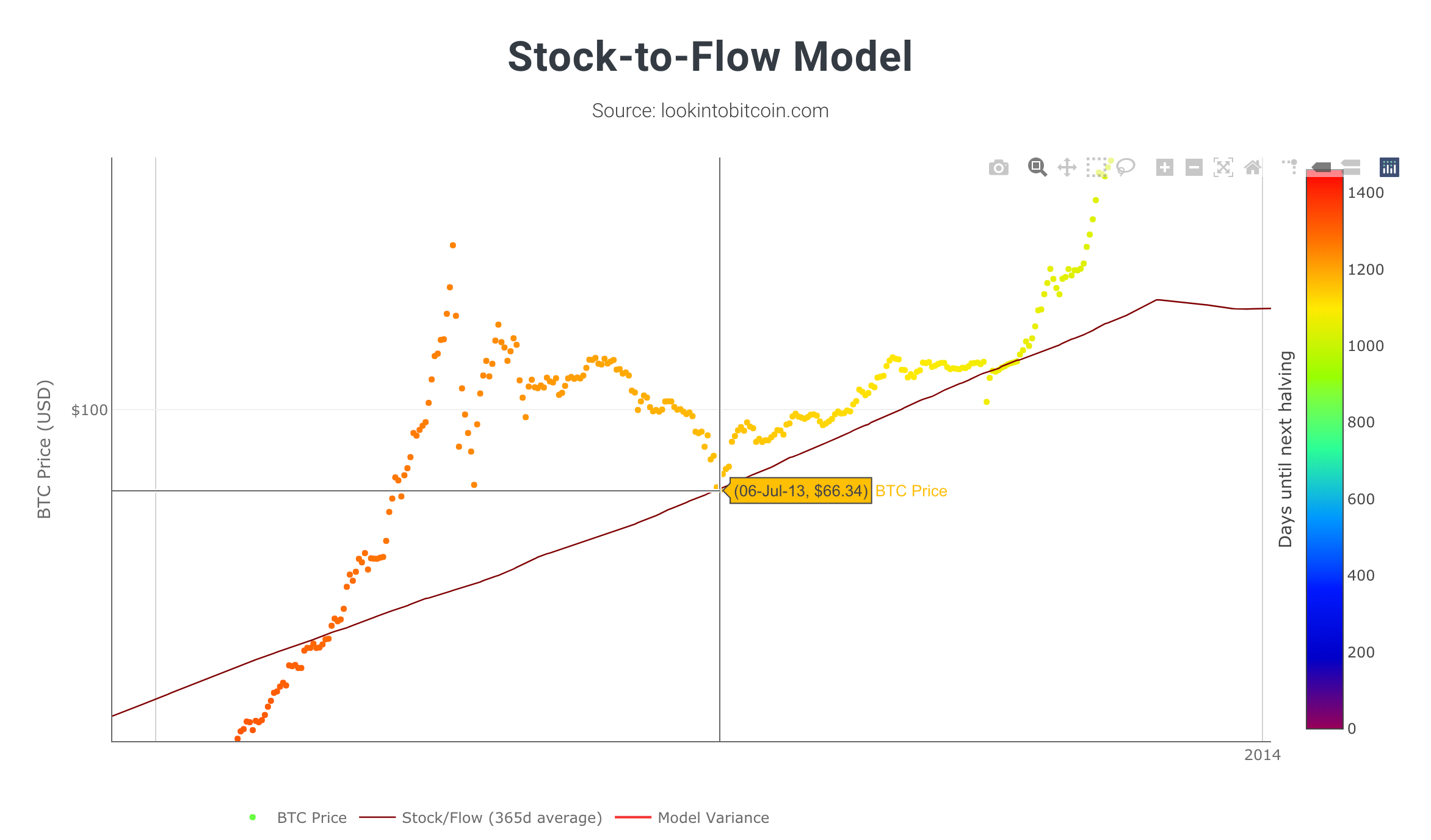 On the 28th of February 2013, Bitcoin’s price was at $32.25 when it broke past the Stock to Flow line: