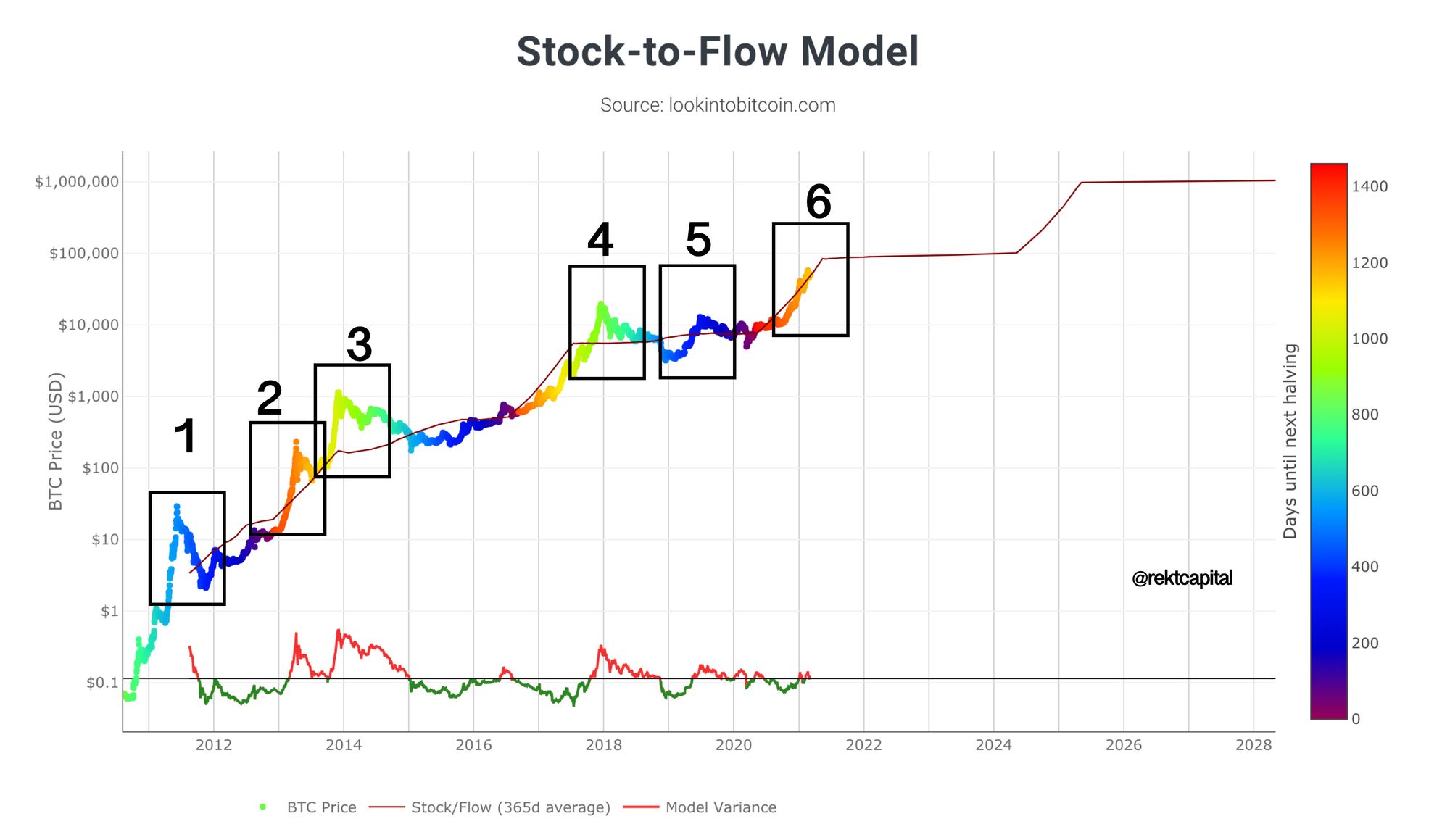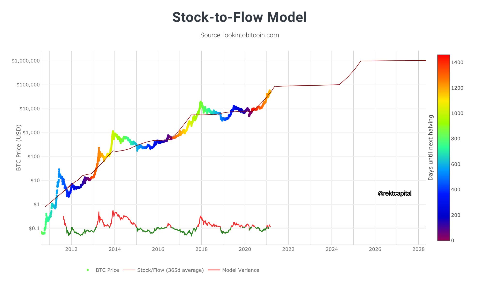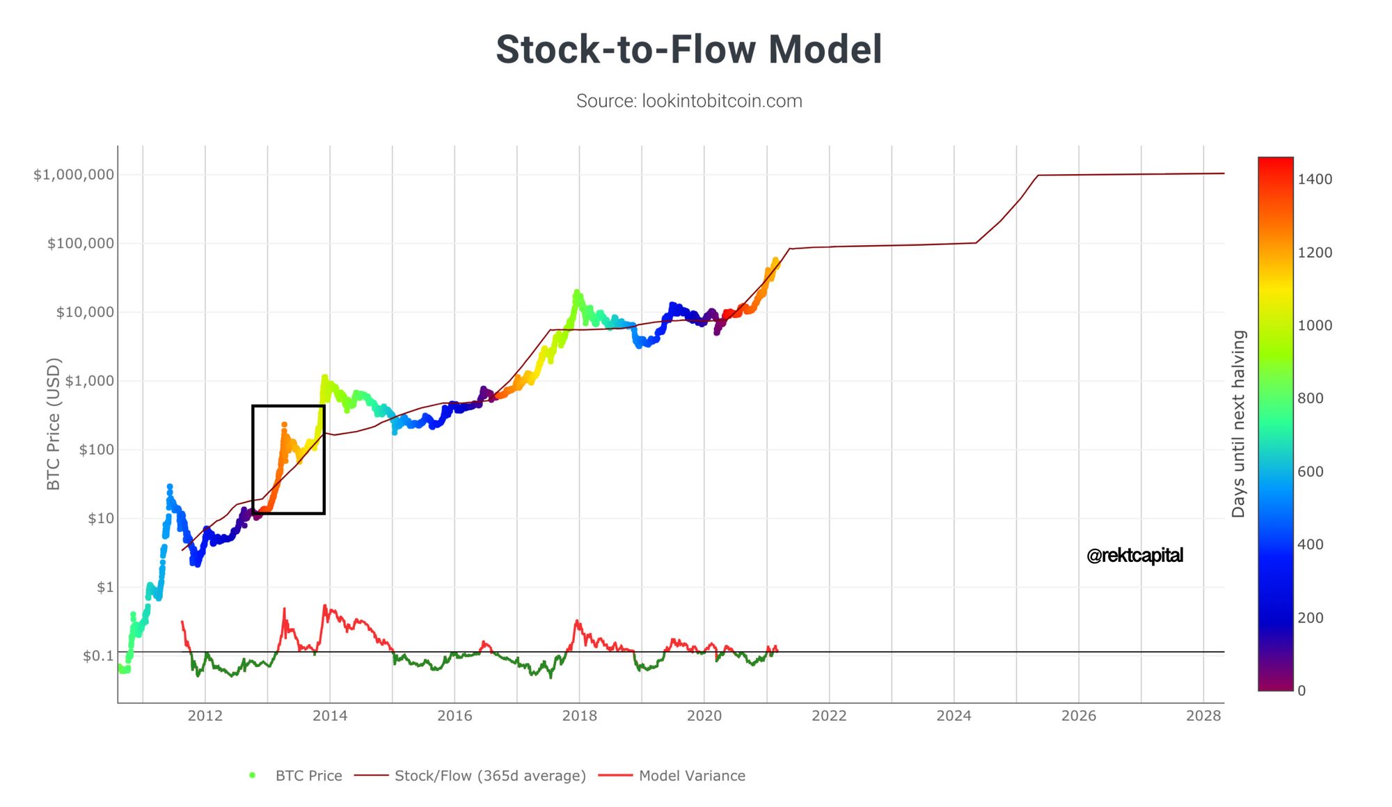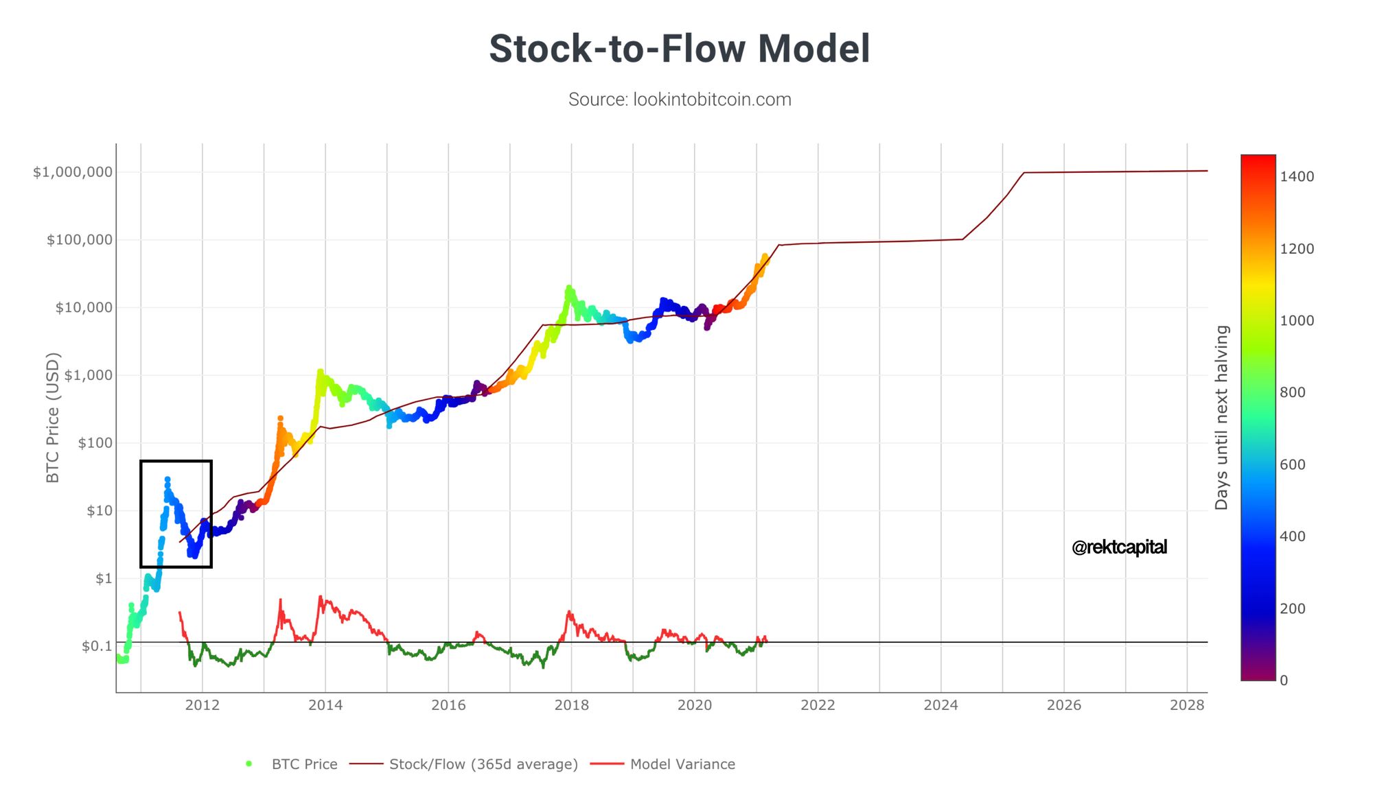 The key takeaway is that the Stock to Flow line can change over time as Bitcoin’s uptrend progresses.