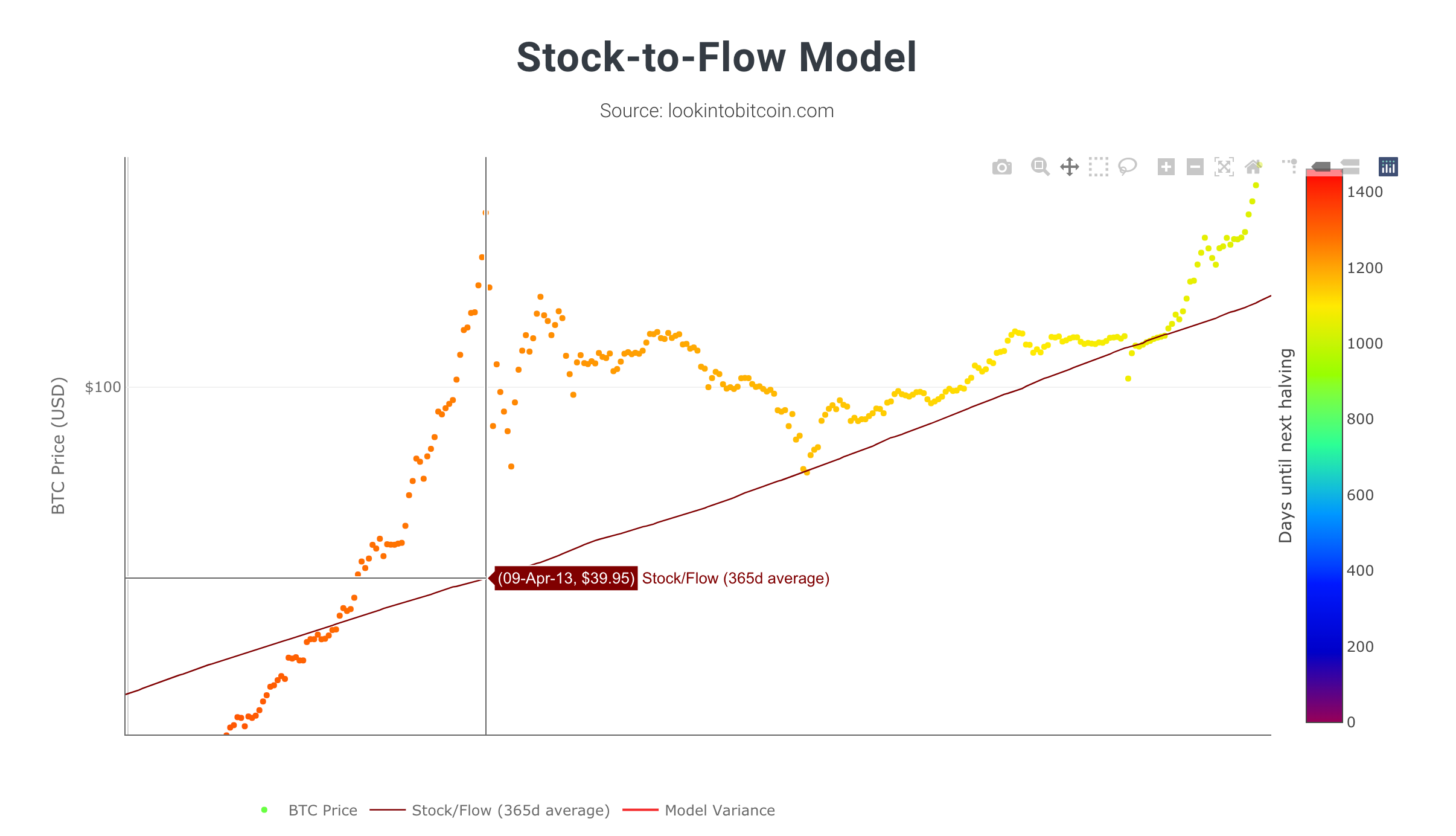 In the span of a few months from late February 2013 to early April 2013, the Bitcoin price point that the Stock to Flow outlined increased by a few dollars (i.e. from $32.25 to $39.95).
