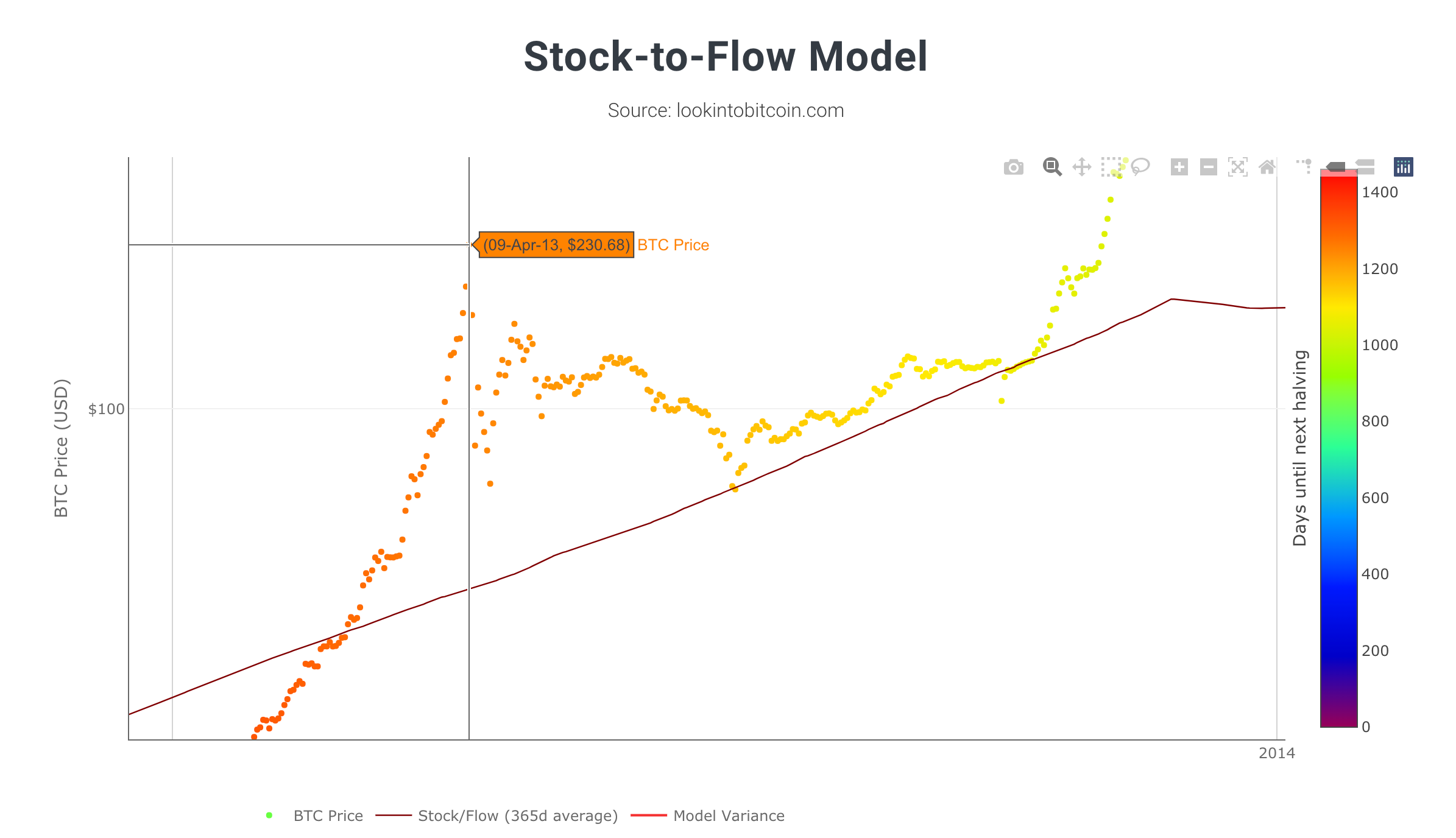 After breaking the Stock to Flow line, Bitcoin’s price rallied exponentially to a peak of $230.68 on the 9th of April 2013: