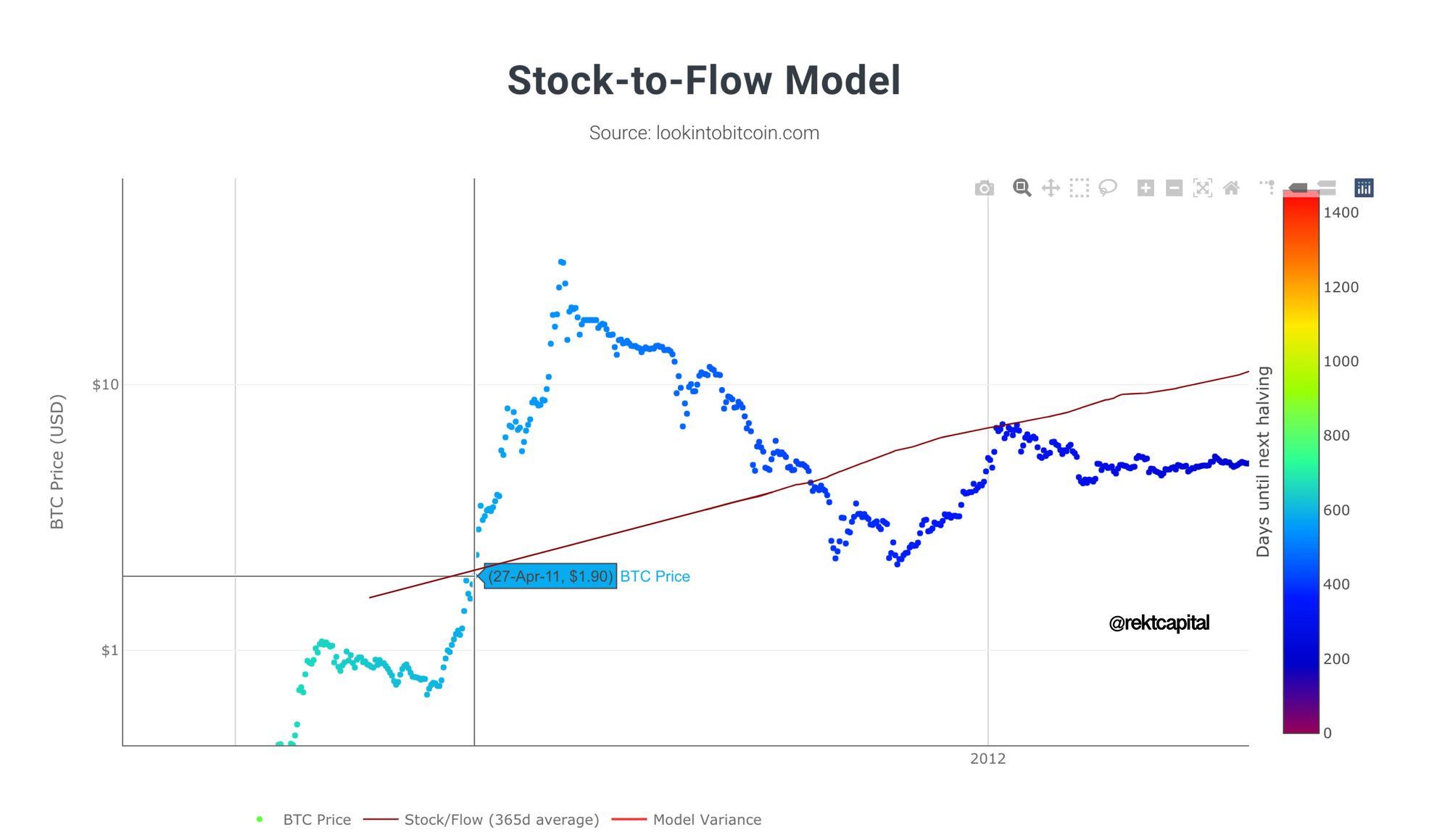 Based on this off-hand extrapolation of the Stock to Flow to this particular period in Bitcoin’s price history, the price point at which Bitcoin crossed the Stock to Flow line to continue its exponential uptrend was approximately $1.90: