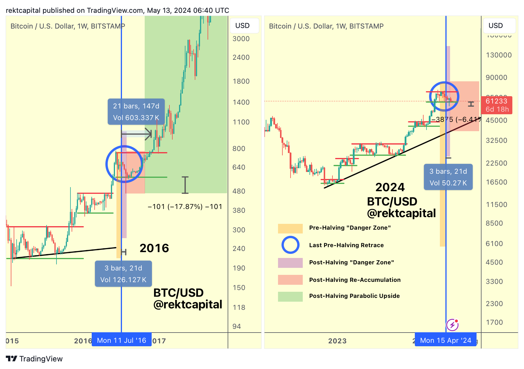 The Post-Halving "Danger Zone" (purple) represents a three-week window after the Halving where historical downside wicks below the Re-Accumulation Range Low tend to occur, specifically and most notably in 2016.