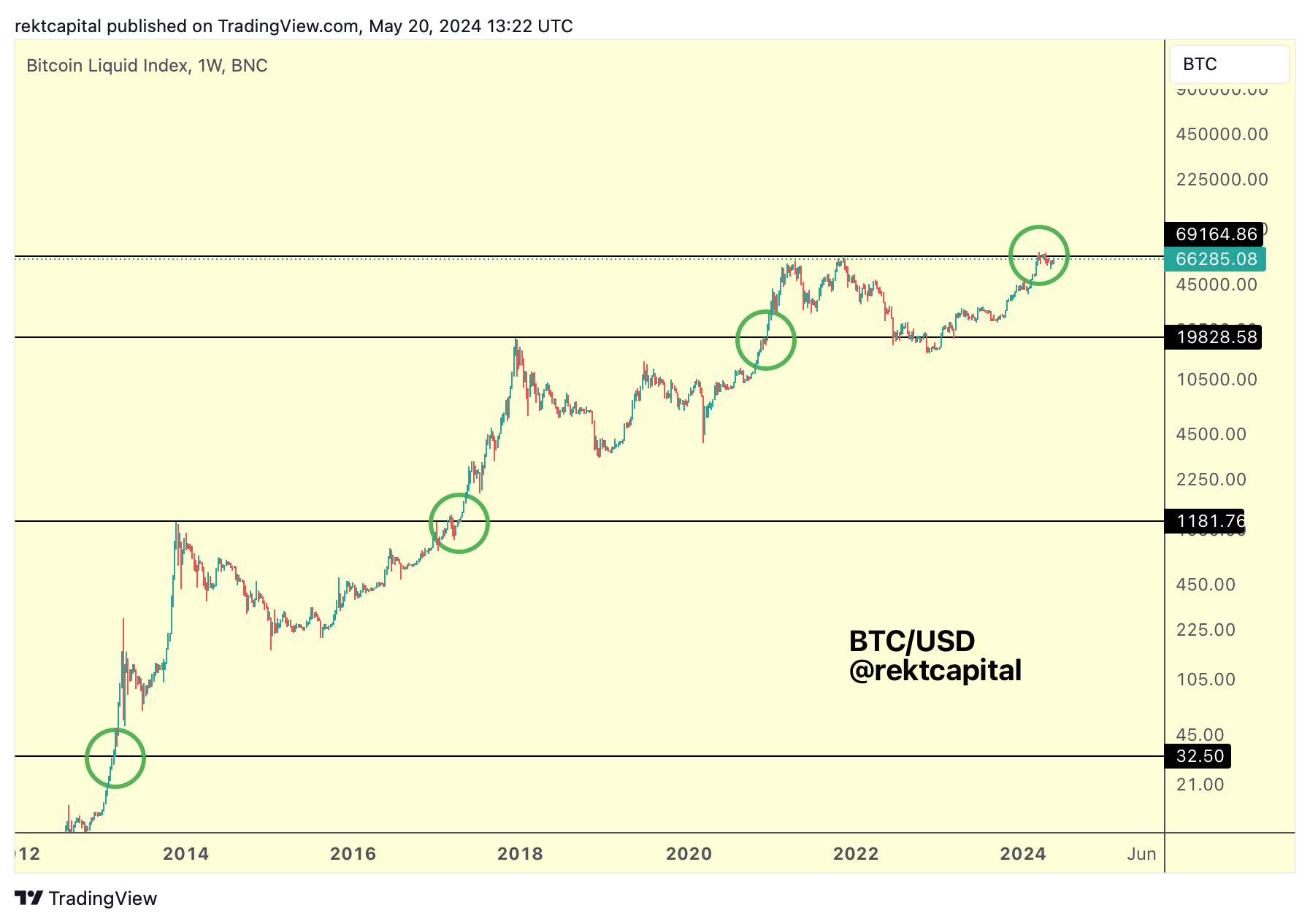The green circles emphasise that BTC tends to consolidate around old All Time Highs; sometimes this can be a short re-accumulation (2021) and sometimes it can be a volatile one (2017).