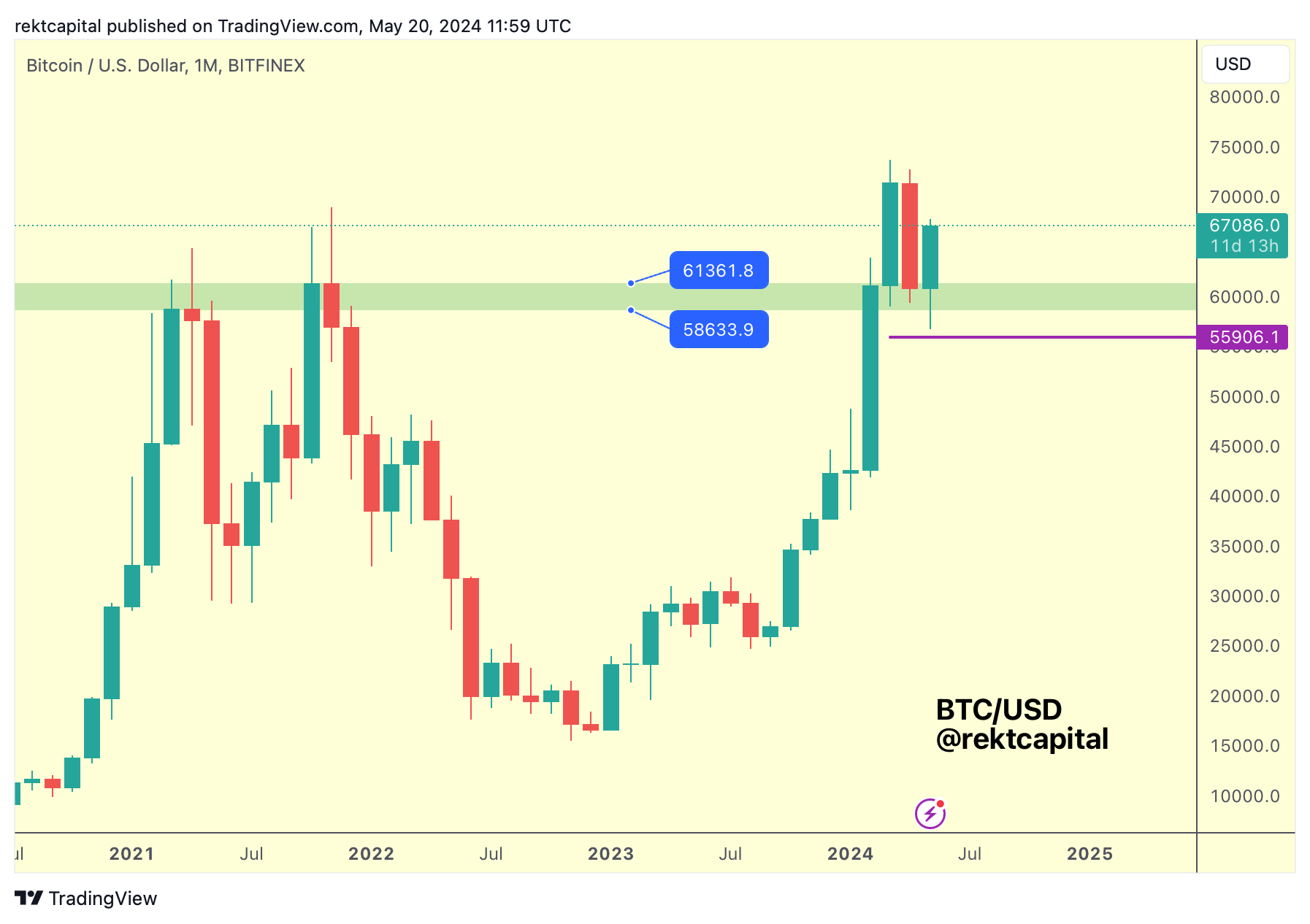 The retest on the Monthly timeframe showcases how Bitcoin is building a base at around the ~$60000 and it is this region that is acting as the key support to this Re-Accumulation Range that is developing around old All Time Highs (black).
