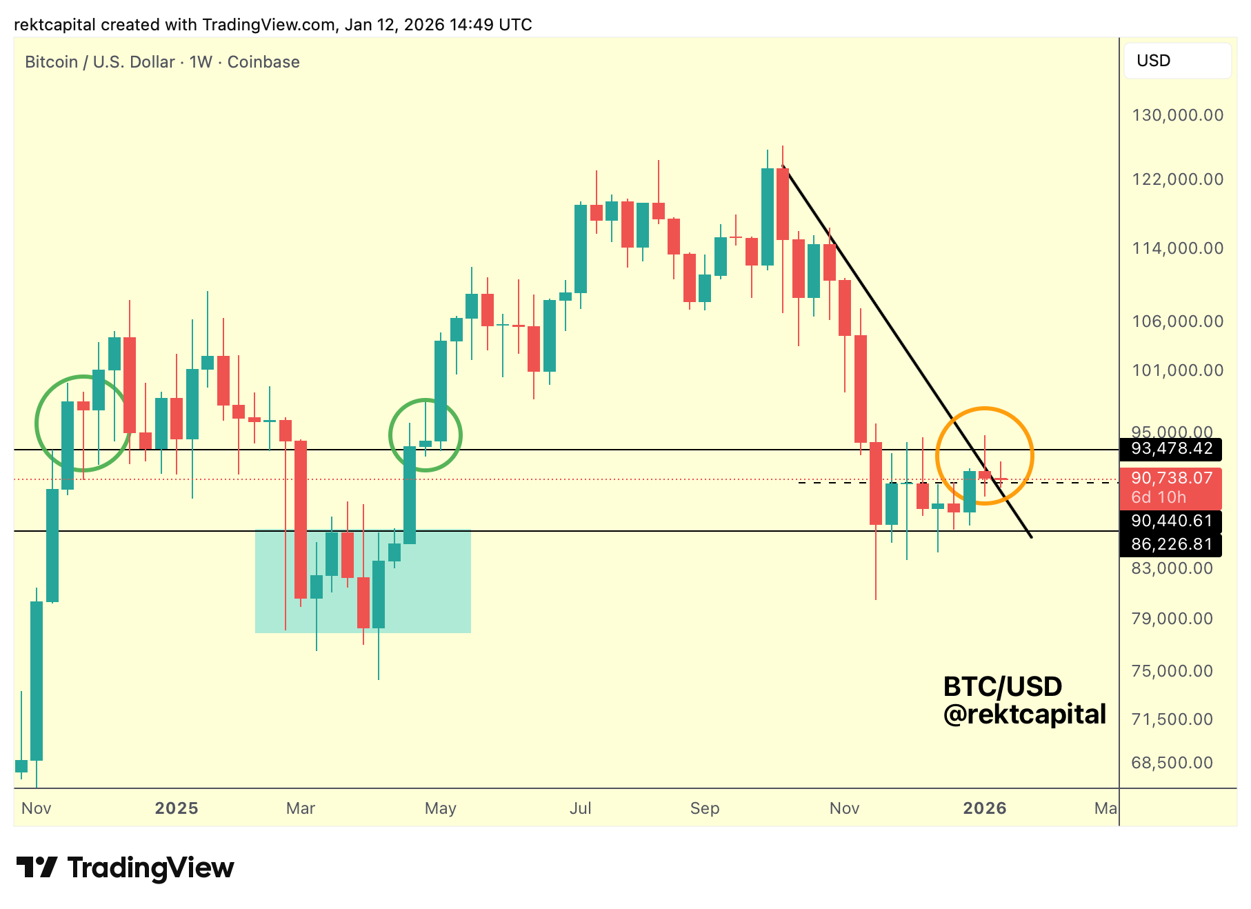 If this Mid-Range and Downtrend confluence continues to hold, it could increasingly function as a springboard, enabling another attempt to Weekly Close above $93.5k and potentially turn it into support to enable the path toward $100k.