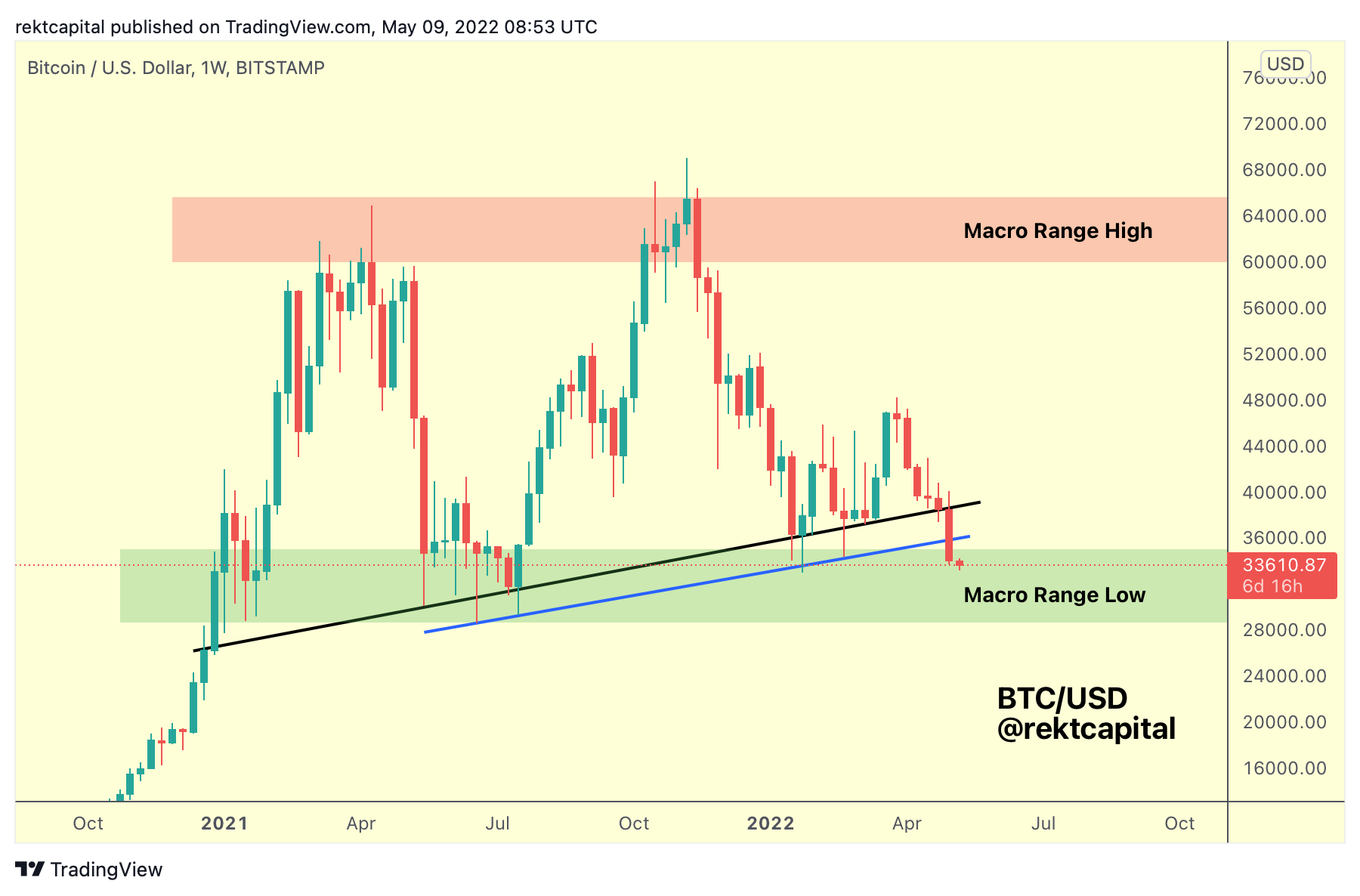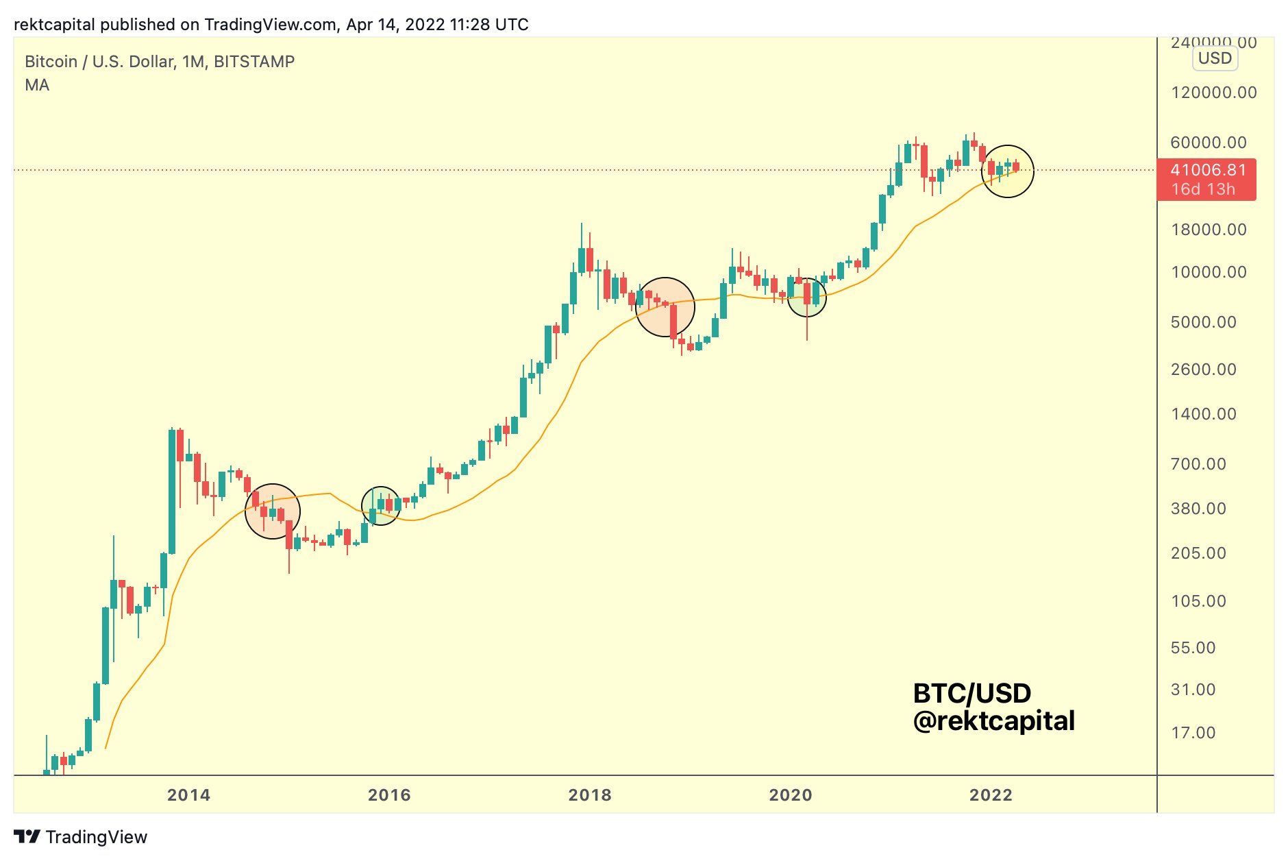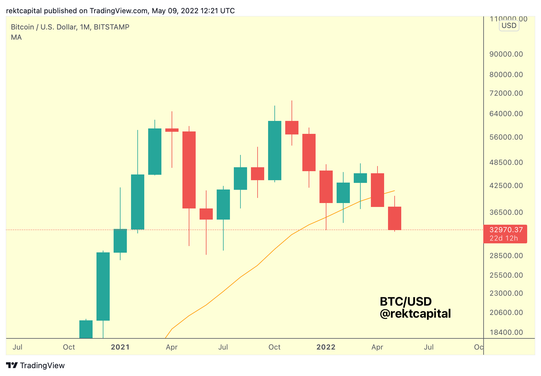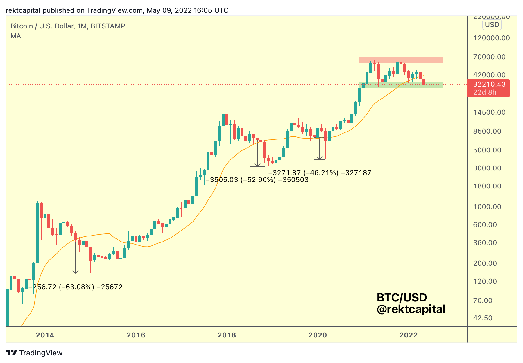 So should BTC rebound from here, it’s crucial that BTC reclaims the orange 20-Month MA as support, otherwise that rebound will have just been a move of relief which would be evidence of weakness in the green area.