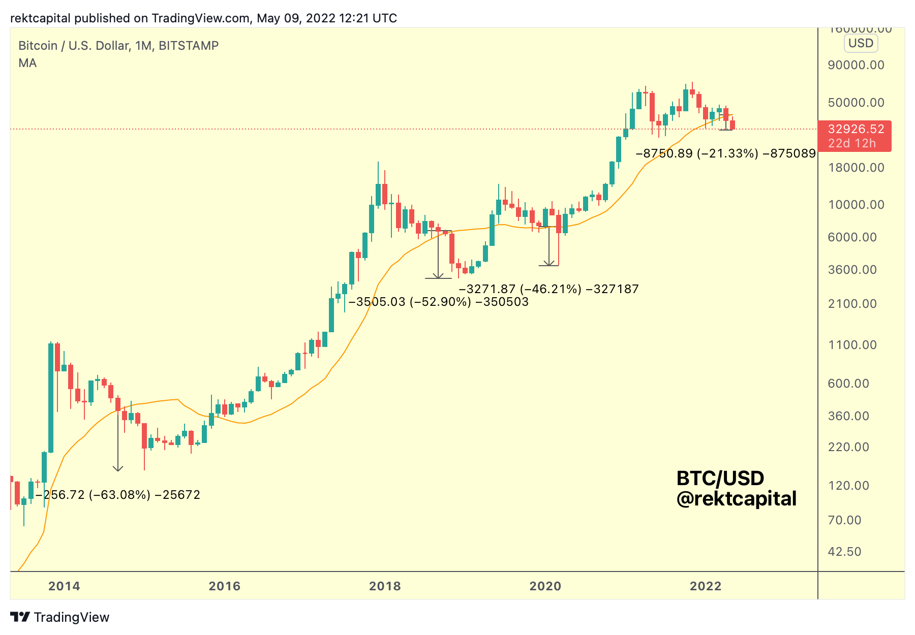 Historically, losing the 20-Month as support has preceded a further -46% to -63% drop in price. It takes months for price to finally capitulate via a long downside wick before forming a multi-month accumulation range at generational lows, which ultimately precedes a new Bull Trend.