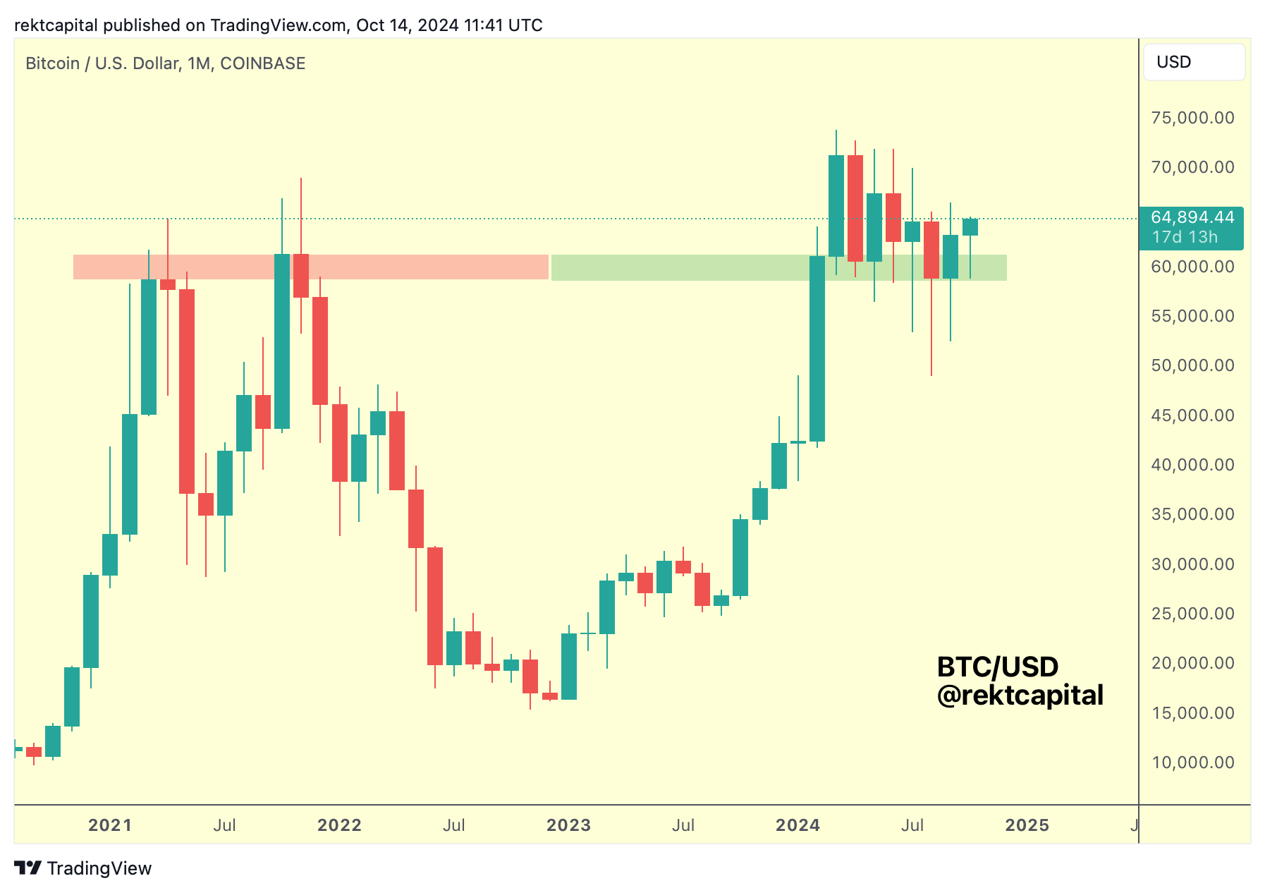 Bitcoin has been able to solidify a support in this overall green area and it has done so at a Higher Low compared to last month's downside wicking lows as well as August's downside wicking lows as well.