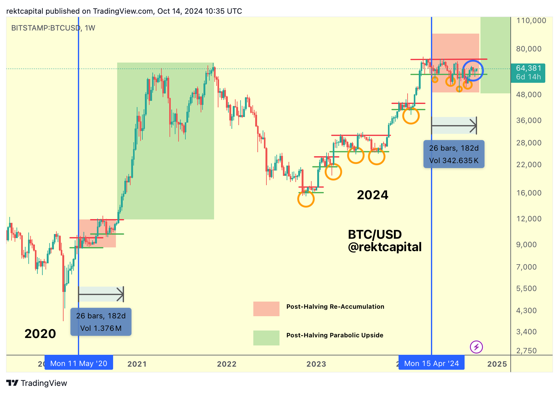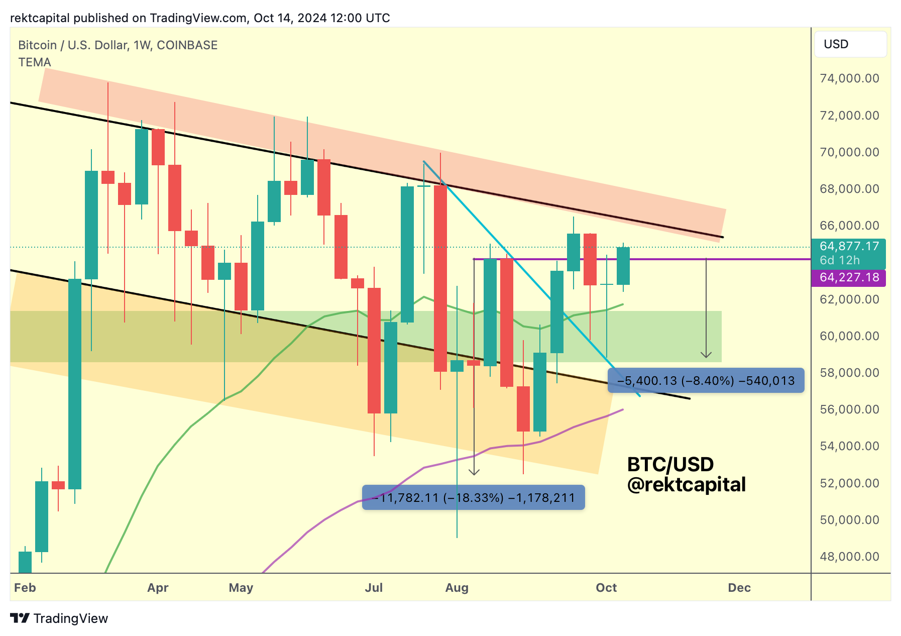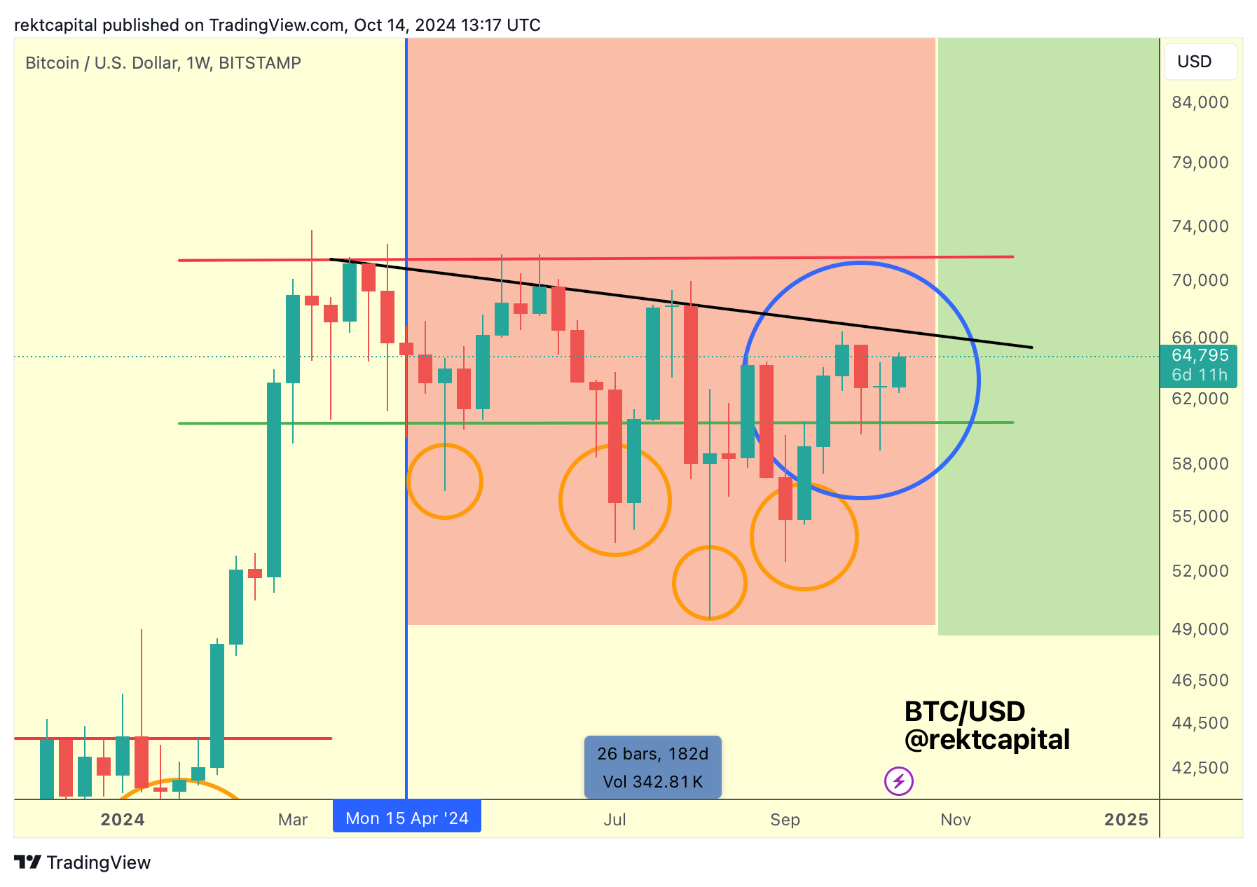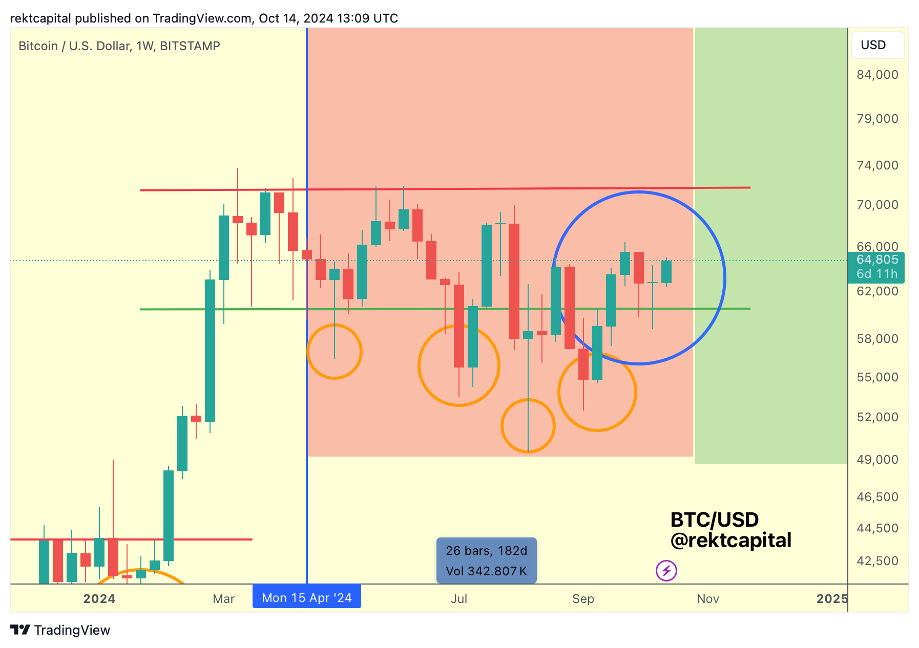 Bitcoin has successfully reaffirmed its support at the Weekly ReAccumulation Range Low of $60600 (green):