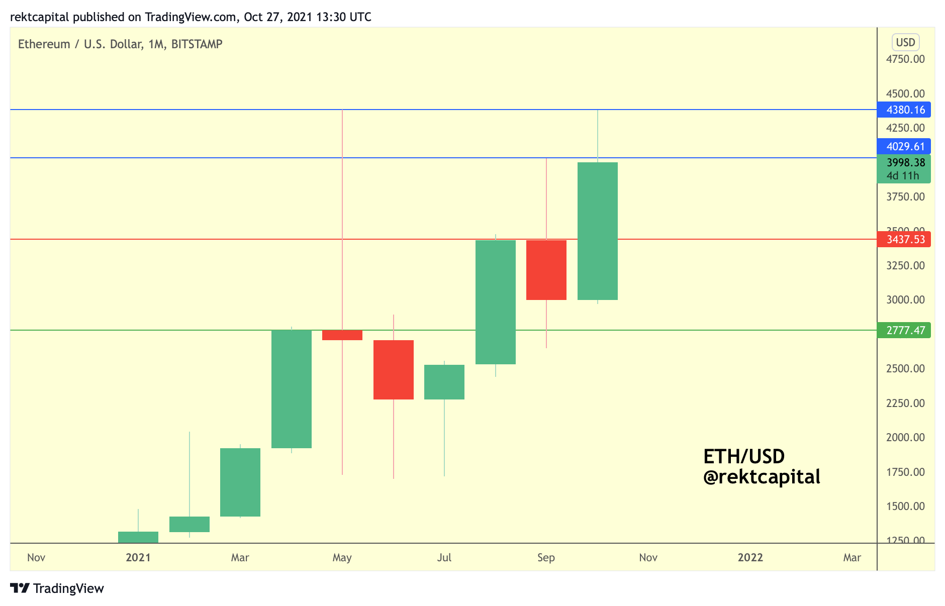 A Monthly Close like this at these highs would also mean that ETH has closed below the two resistance levels it needs to breach for new All Time Highs: ~$4000 and $4380 (blue):