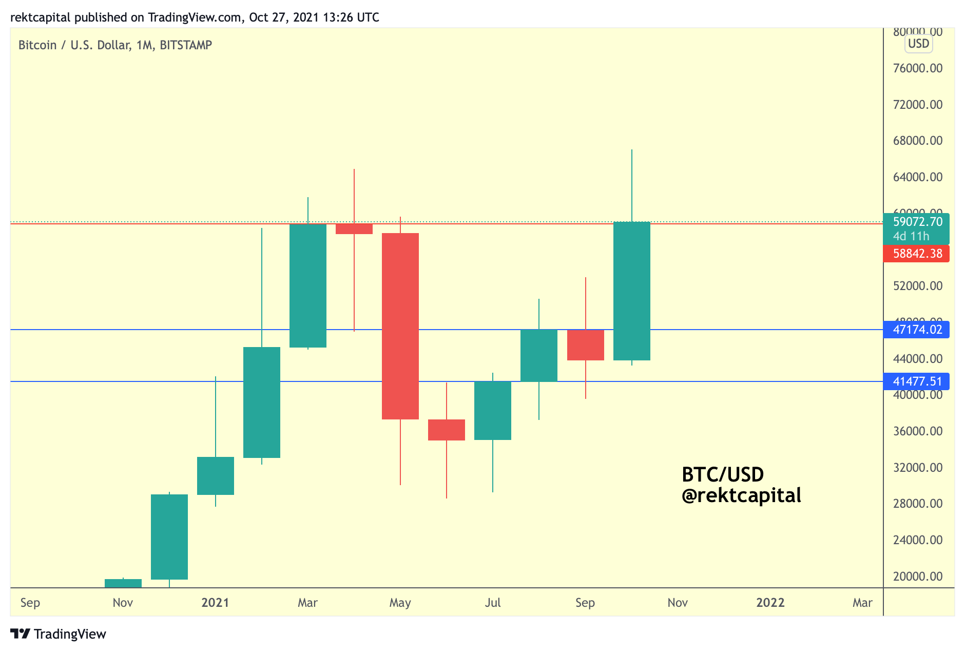 A Monthly Close above this red resistance level of ~$58800 would be a great initial sign for this resistance potentially giving way in November.