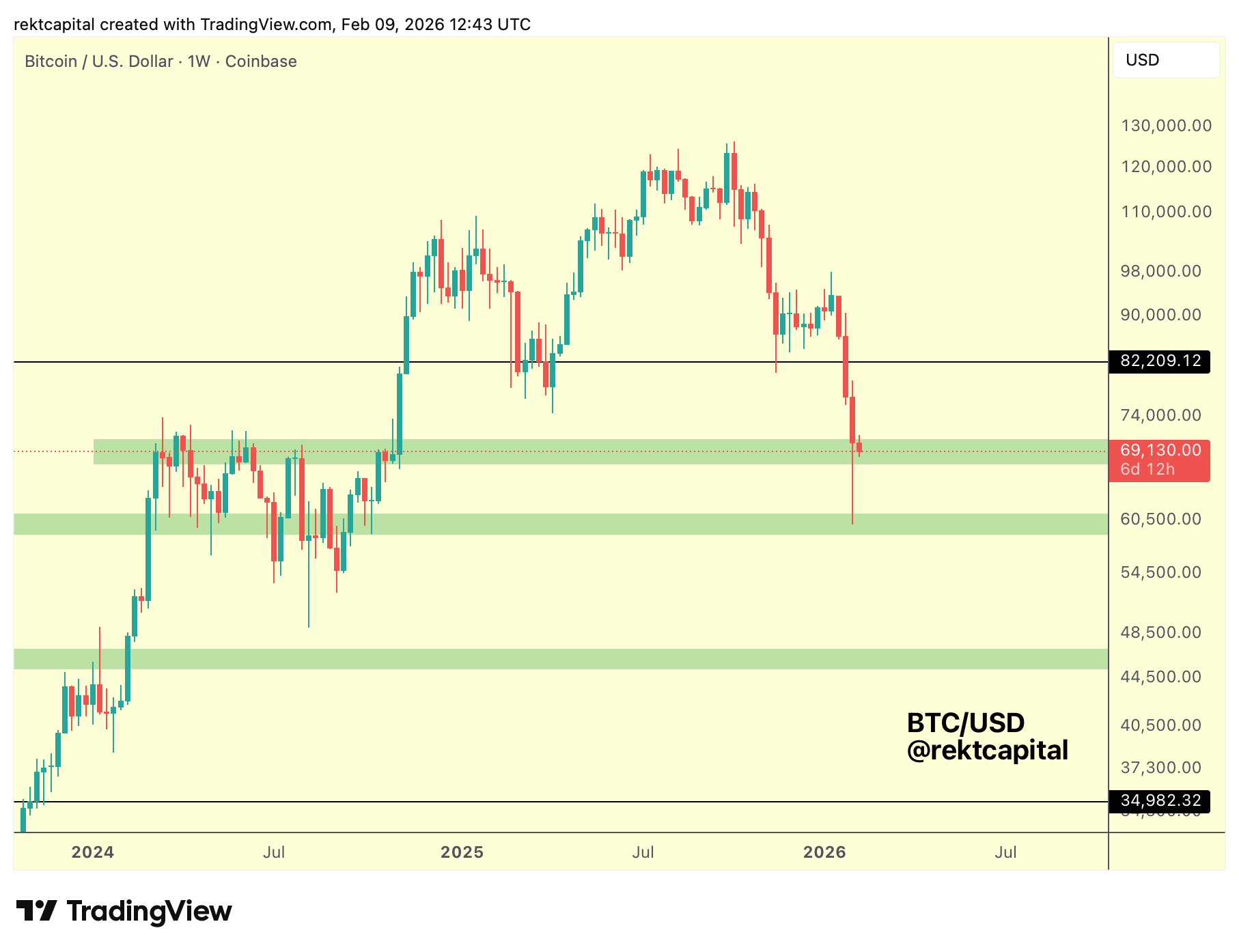 The upper green region on the other hand — which previously acted as post-halving range resistance — has not been decisively reclaimed as support and is instead showing early signs of flipping into resistance on the Weekly timeframe: