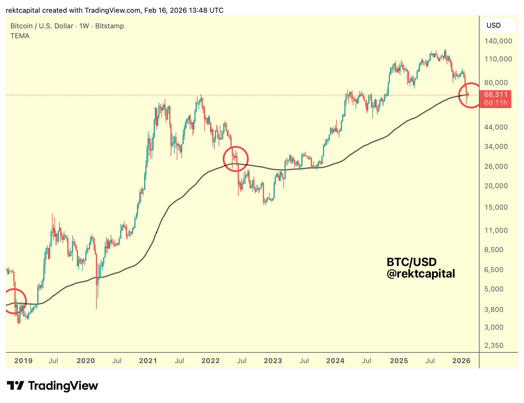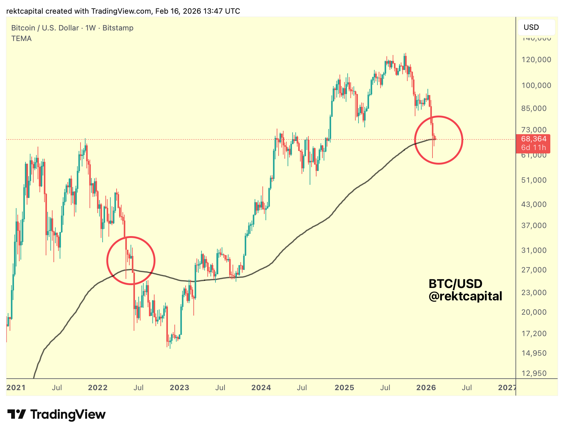 Historically, in 2022, post-breakdown relief clusters initially tagged the 200-week EMA as support via downside wicking.